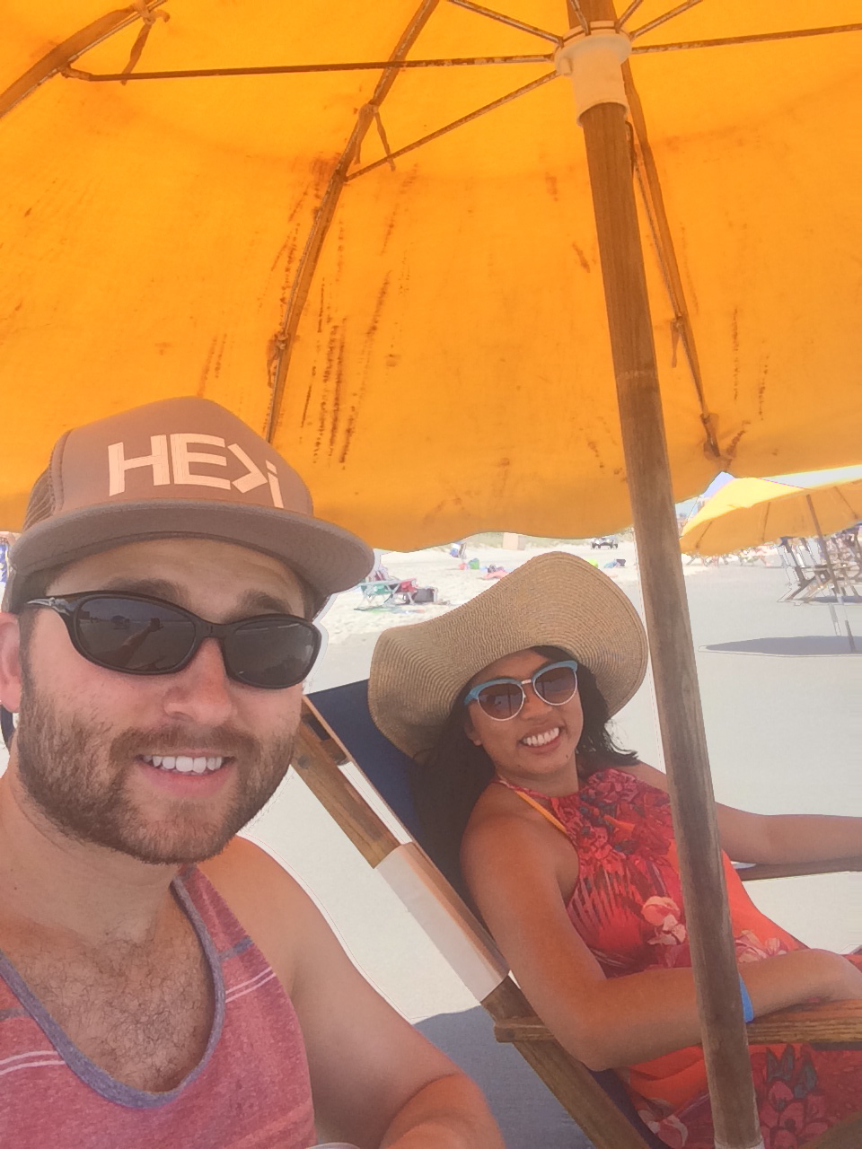 We drove in Friday afternoon and went straight to the beach. The water felt great! We sat in these nice beach chairs under a yellow umbrella. Apparently, they weren’t free. The lifeguard came up to me and said, “You have to rent these for $30 a day, but it’s so late in the day that I don’t care. Y’all can sit here.” We will. Thanks.