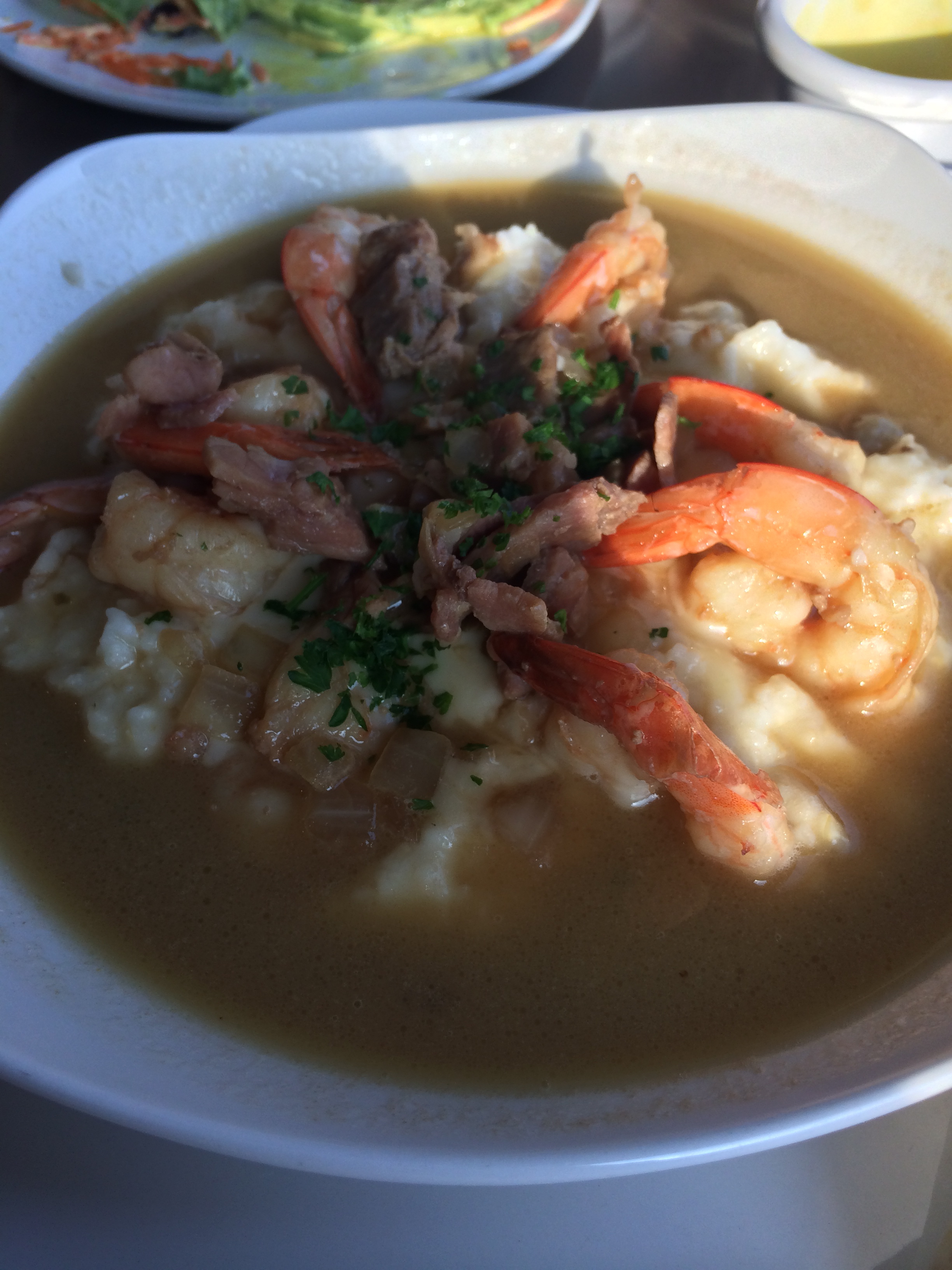 Later that day, we ate at Pier House Restaurant. We wanted to sit outside, but their porch only had a basket menu and we realllly wanted some good seafood, so we just sat inside by a window. Hubs got the 3 item fried seafood combo, which included shrimp, flounder, and crab. I had the shrimp and grits. Both were delicious! Their happy hour special was pina colada and we can’t resist a good special 😉
