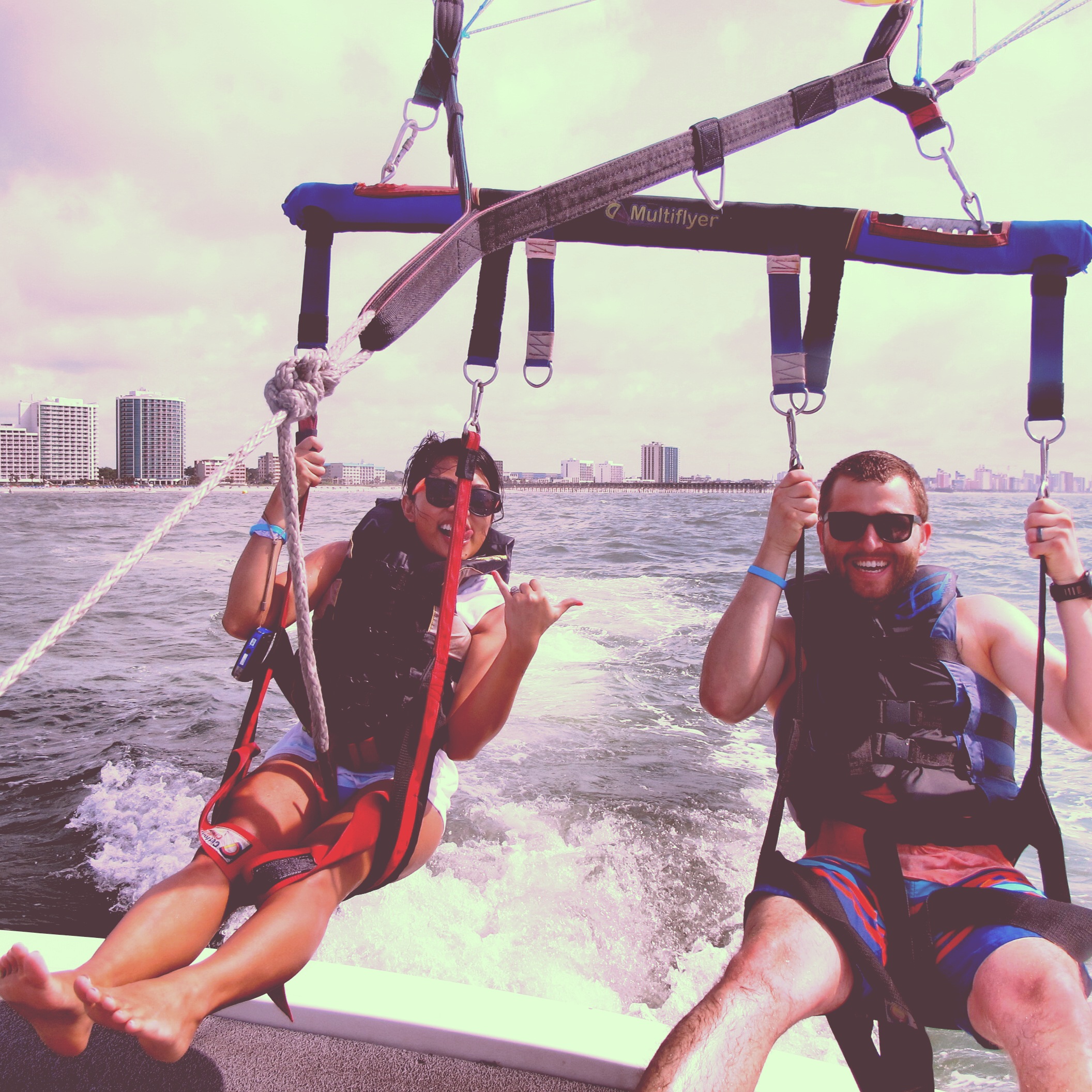 We started the next morning by parasailing. I’ve been before, but hubs hasn’t. But even if he had, we haven’t been together and we would have done it to experience it together. We took a banana boat ride out there. Basically, we sit in these two huge yellow banana-like inflatable and get pulled by a jet ski to our parasail boat. That was fun in itself! Once we got on our boat, we didn’t sit long, we were first ones up!