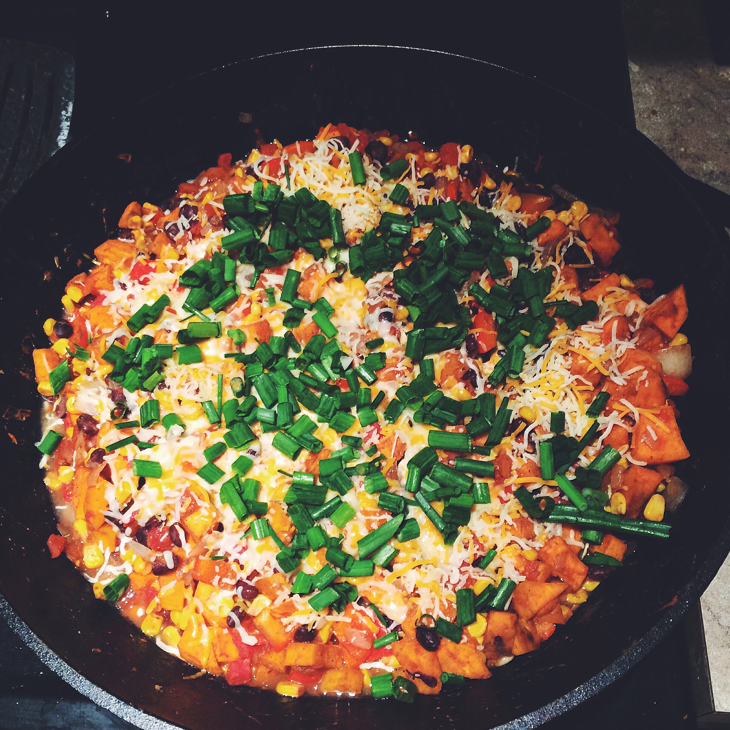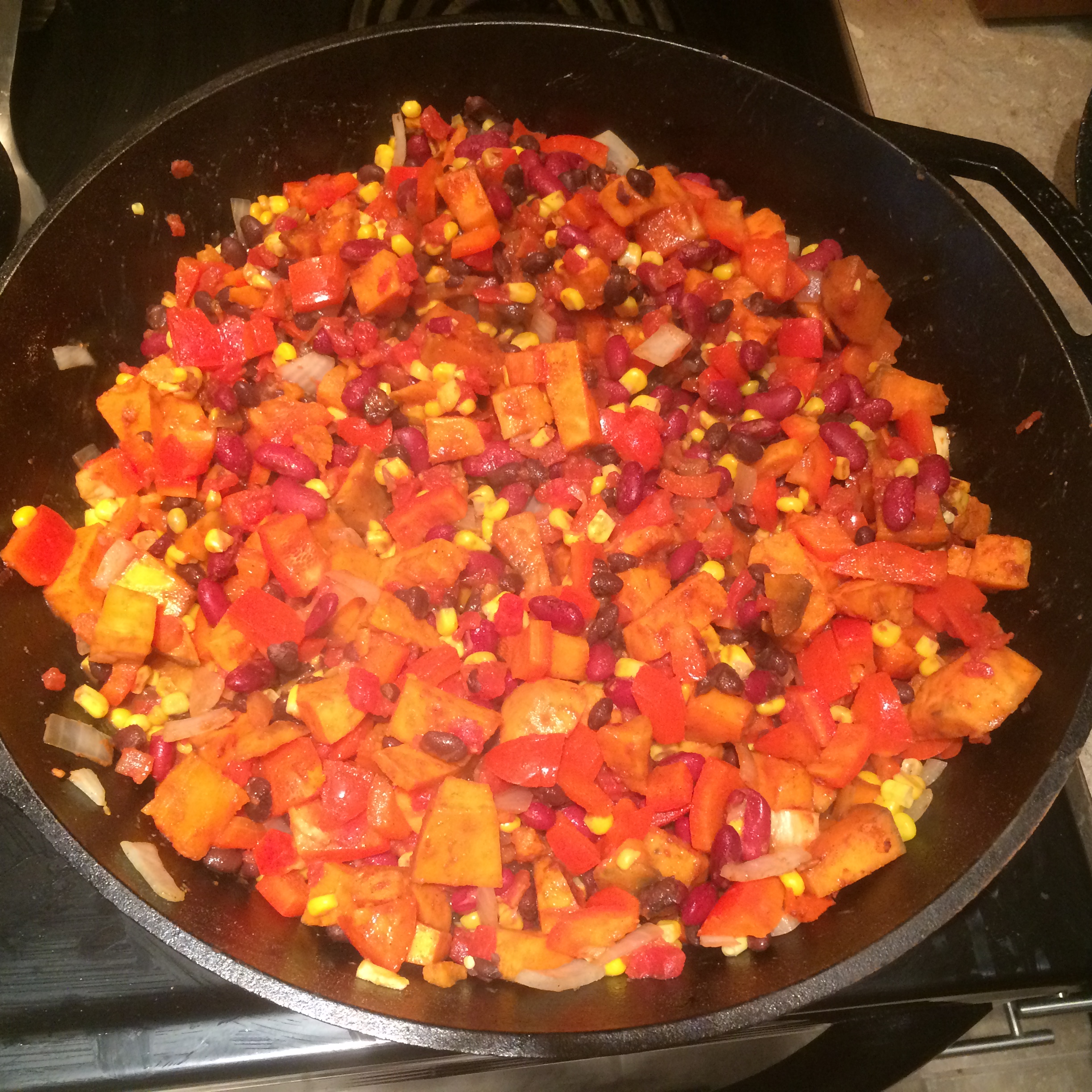 1. Preheat large deep skillet on medium heat and add olive oil, spreading with spatula. Add sweet potatoes, 1/2 tbsp cumin, 1/2 tsp salt and cook for 5 minutes, stirring occasionally. Add onion, garlic, bell peppers and cook for another 3 minutes, stirring occasionally. Add black beans and corn, cook for another 2 minutes, stirring occasionally.