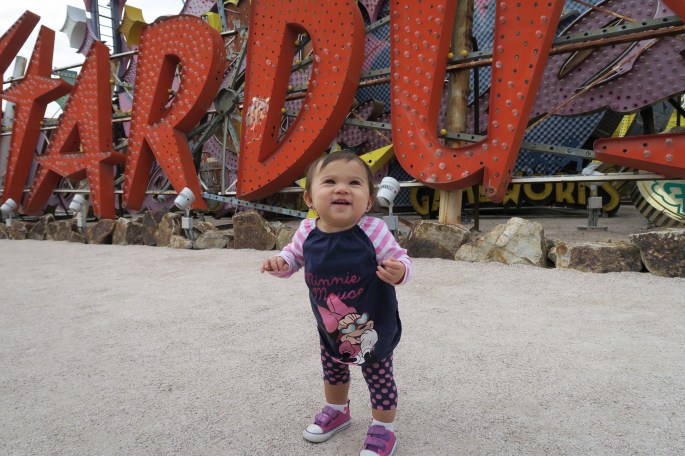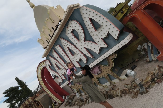 - Neon Museum– Do you ever wonder where all those neon lights go after the strip is done with them? Well, they go to the boneyard, of course! This was a pretty cool experience. We were able to see the first neon sign on Freemont St (the old strip) and other famous signs. You have to book an hour guided tour to see the collection and stay with the group. She just turned 11 months old and wasn’t quiet the runner she is now, so we carried her using our ergo carrier. I’m not sure how she would do now with her running around. *check online for their covid restrictions